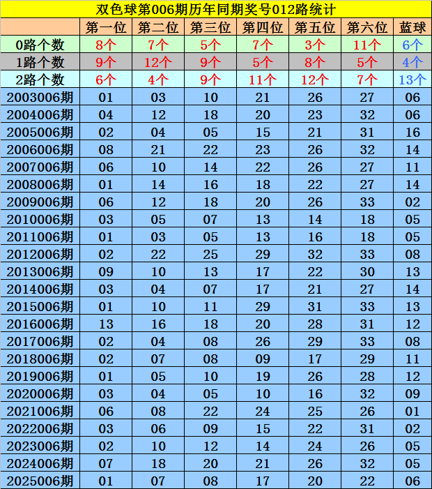 蓝球分析:在第006期历史同时开奖中,蓝球012路比为6:4:13,其中0路蓝球:06出现3次,12出现2次,09出现1次;1路蓝球:13出现2次,01、16出现1次;2路蓝球:05出现4次,14出现3次,02、08、11出现2次,现在1路号码遗漏4年,本年同时舍弃1路蓝球,参考0路蓝球09。
