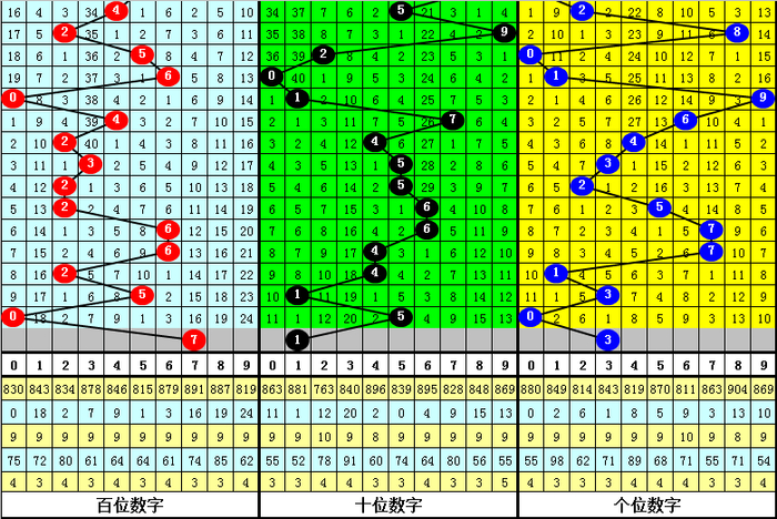 二、百位分析:上期开出号码0,前10次号码0出现之后下期阔别开出号码:2456550864,其中号码大小比为6:4,基本合手平;奇偶比为3:7,奇数号码走势较冷;012路比为3:2:5,1路号码走势相对较冷。本期参考号码:7。