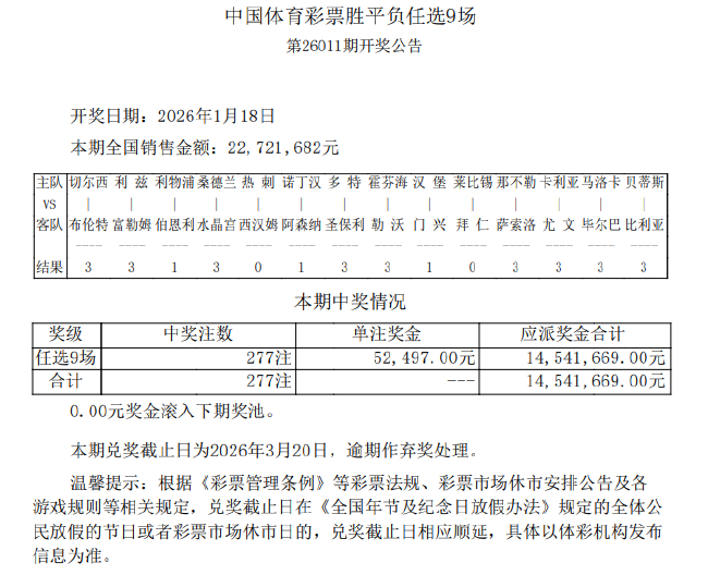 北京时分1月18日,输赢彩第26011期任九开奖效果揭晓,本期任九开出277注52,497元。本期任九总投注额为22,721,682元。
